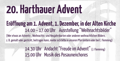 Herzlich Willkommen auf der Internetseite unserer Gemeinde Zu folgenden Veranstaltungen möchten wir Sie herzlich einladen: Alle weitern Termine des 20. Harthauer Adventes entnehmen Sie bitte dem Gemeindebrief.